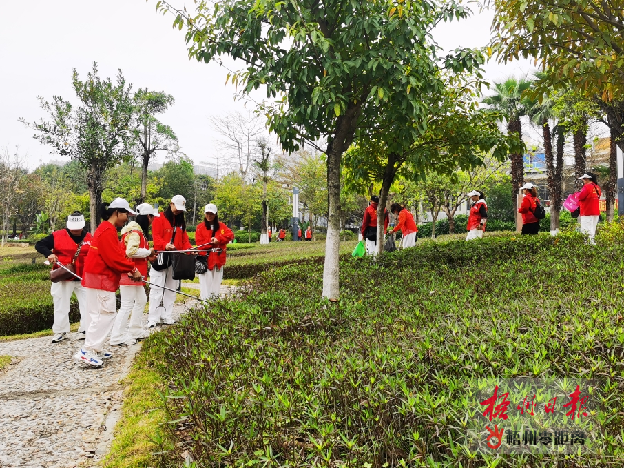 3月5日,志愿者在玫瑰湖公園撿拾垃圾,合力把公園道路和草坪清理干凈。梧州日報記者 朱元冬 攝