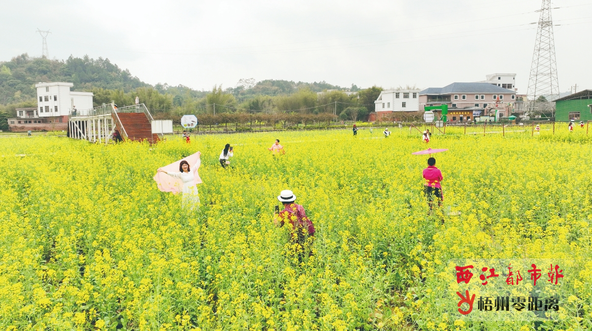 3月5日,位于龍圩區龍圩鎮念村村的稻漁種養示范基地內的百畝油菜花盛開,在春日陽光下格外迷人,吸引眾多游客前來游玩拍照。 鄭賢基 攝