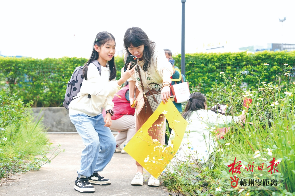 3月23日,孩子們將自己制作的展板套在野花上拍照留念。梧州日報記者 楊揚 攝