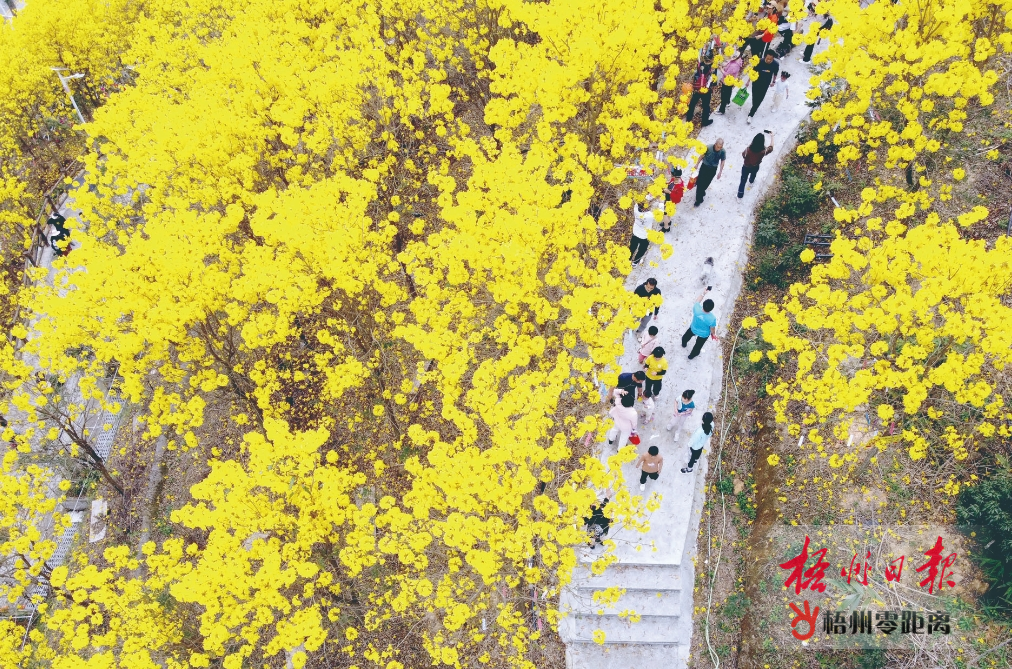 正是春光燦爛之時(shí),位于萬(wàn)秀區(qū)東出口的甜蜜家生態(tài)蜂業(yè)園內(nèi)黃花風(fēng)鈴木花開(kāi)正盛,整個(gè)山頭一片金黃,吸引眾多市民前來(lái)春游賞花。