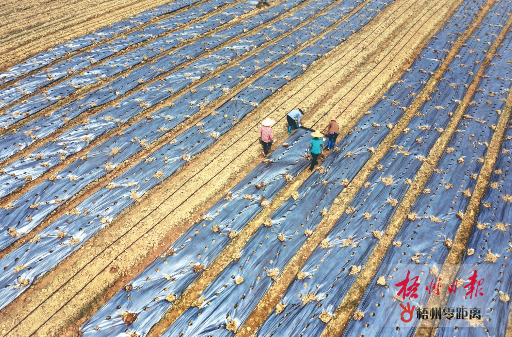 3月28日,在龍圩區大坡鎮交村村秋葵產業標準化種植基地,農民搶抓農時種植經濟農作物秋葵。