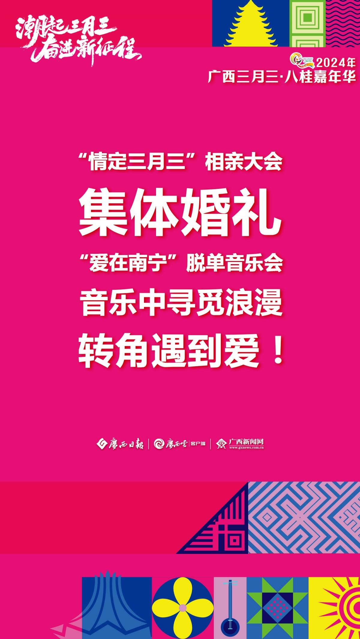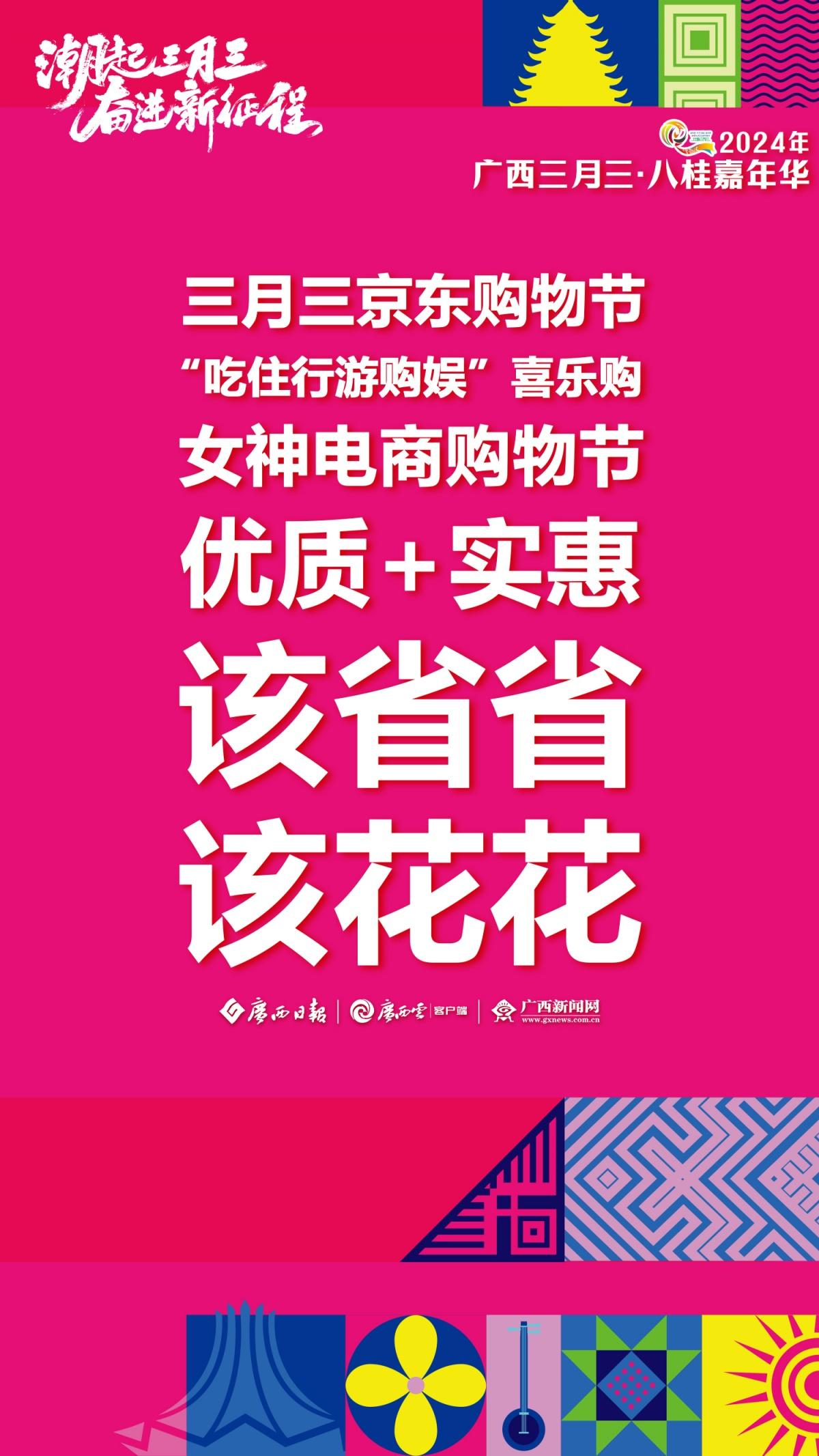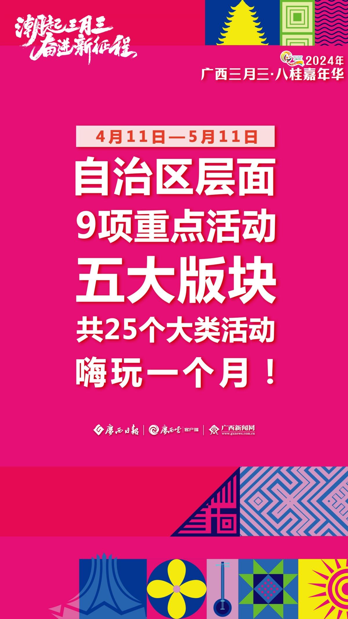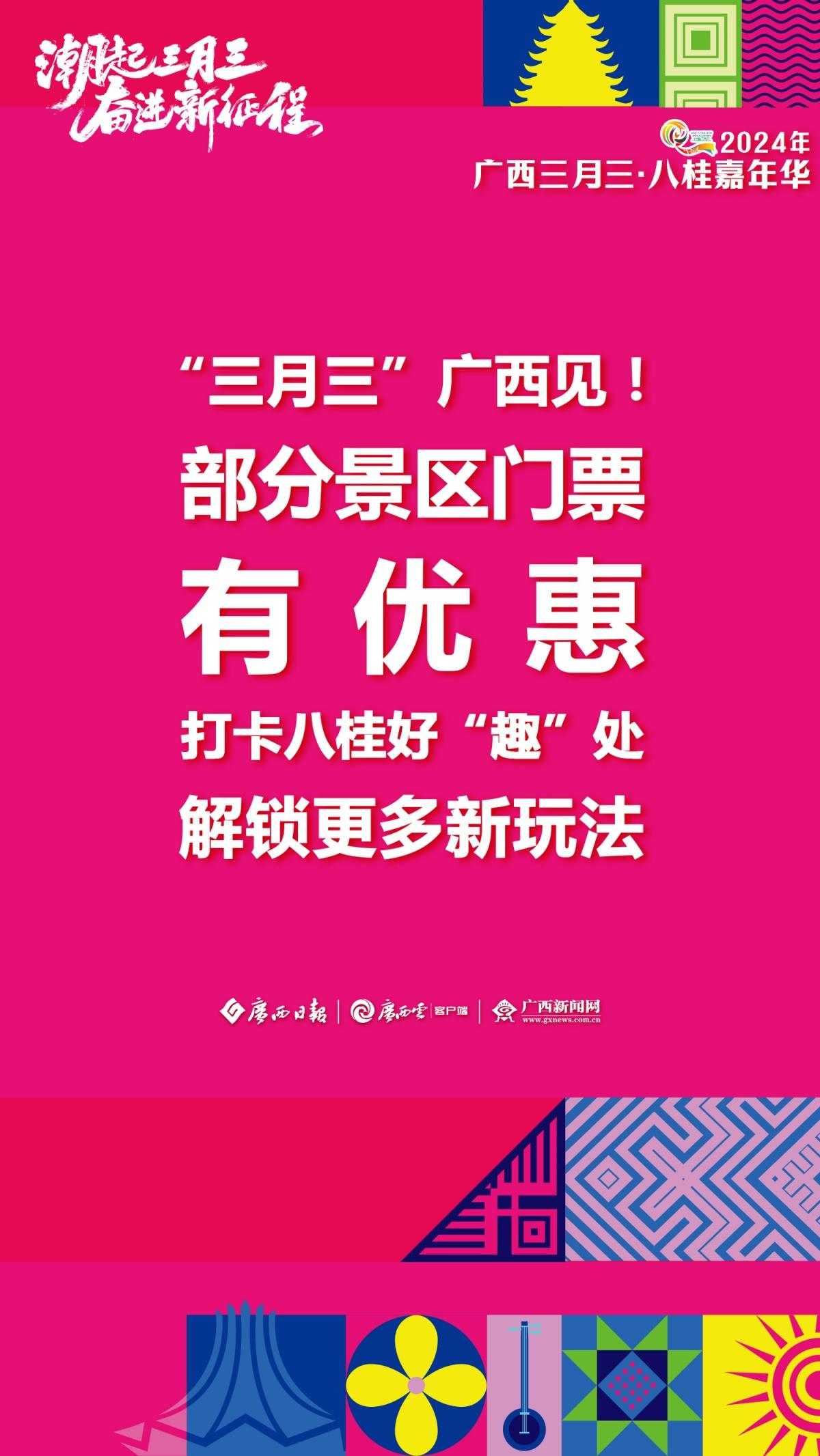2024年“廣西三月三·八桂嘉年華”新聞發(fā)布會(huì)于3月28日上午舉行。發(fā)布會(huì)上介紹,今年廣西三月三期間,自治區(qū)層面將開展9項(xiàng)重點(diǎn)活動(dòng)和25個(gè)大類活動(dòng)、多家4A級(jí)以上旅游景區(qū)向全國(guó)游客推出首道門票五折優(yōu)惠、22個(gè)專場(chǎng)電商活動(dòng)為消費(fèi)者提供優(yōu)質(zhì)商品……此外,“民歌一條街”、國(guó)潮動(dòng)漫節(jié)、電競(jìng)大賽、相親大會(huì)等活動(dòng)潮玩不停,樂趣無限!廣西日?qǐng)?bào)-廣西云客戶端推出一組極簡(jiǎn)海報(bào) ,為你揭秘廣西三月三活動(dòng)安排。