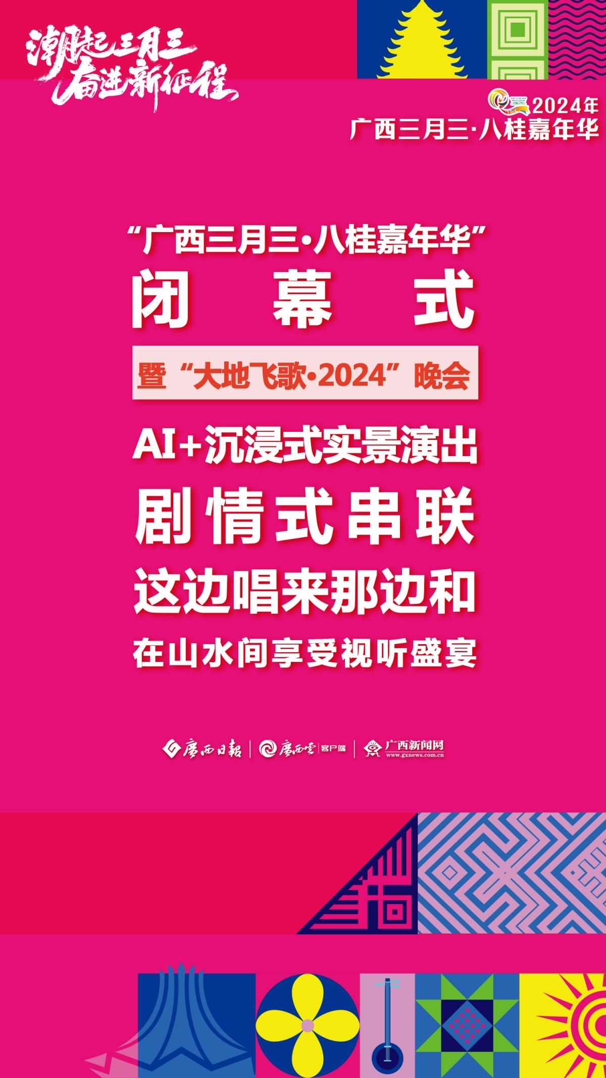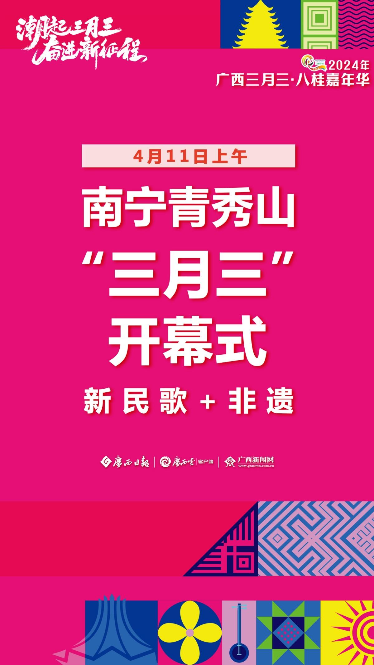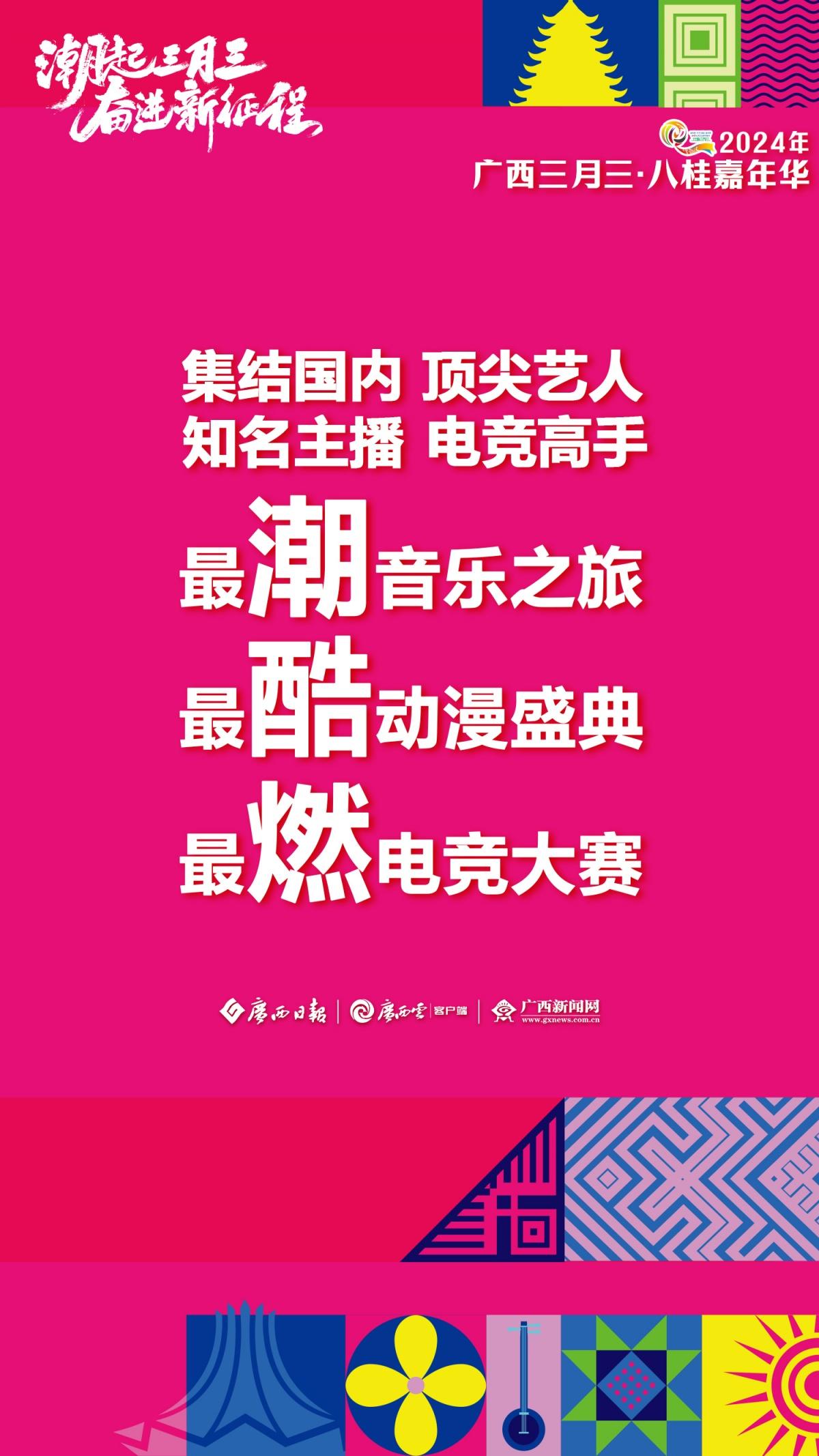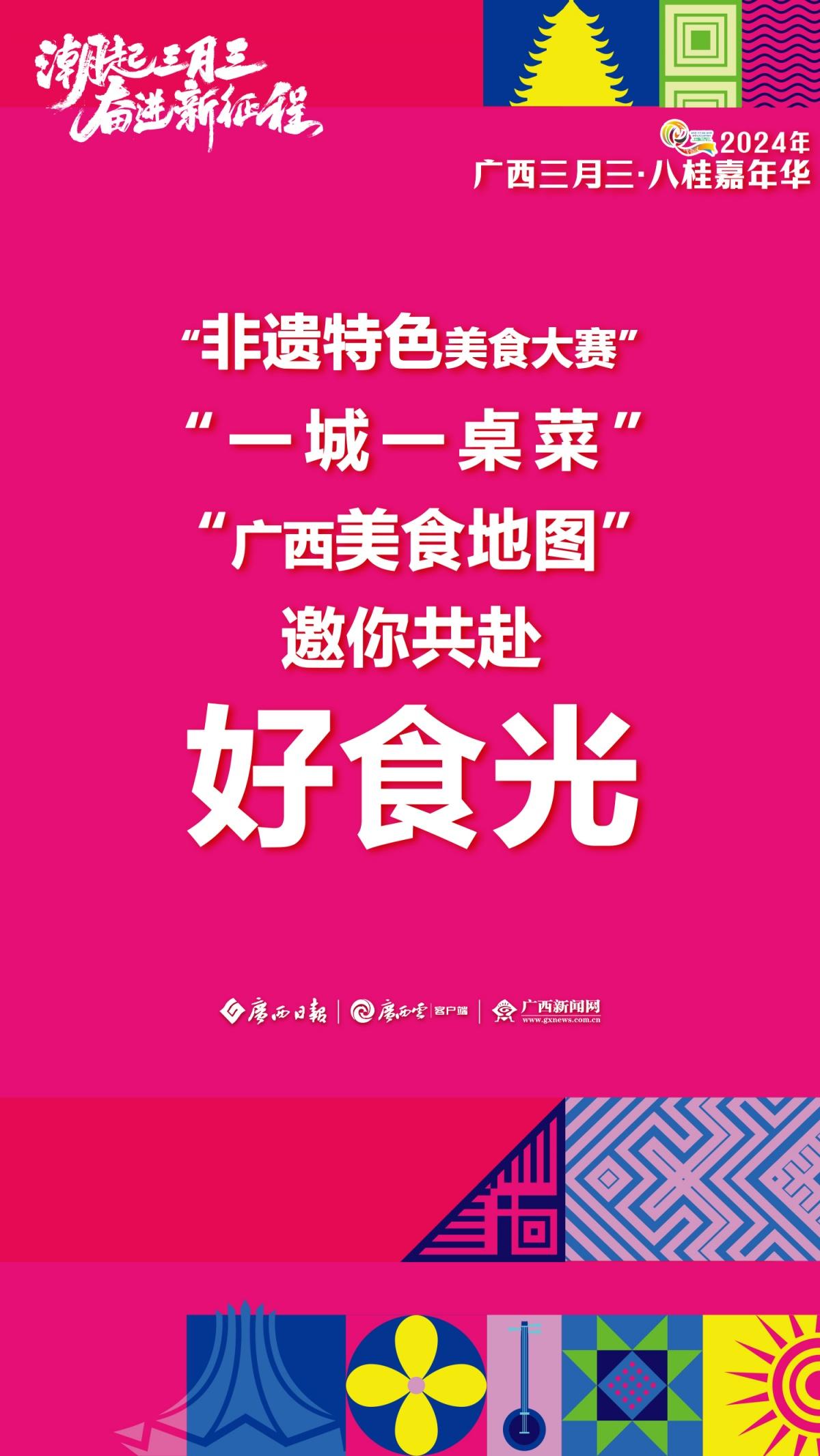 2024年“廣西三月三·八桂嘉年華”新聞發(fā)布會(huì)于3月28日上午舉行。發(fā)布會(huì)上介紹,今年廣西三月三期間,自治區(qū)層面將開展9項(xiàng)重點(diǎn)活動(dòng)和25個(gè)大類活動(dòng)、多家4A級(jí)以上旅游景區(qū)向全國(guó)游客推出首道門票五折優(yōu)惠、22個(gè)專場(chǎng)電商活動(dòng)為消費(fèi)者提供優(yōu)質(zhì)商品……此外,“民歌一條街”、國(guó)潮動(dòng)漫節(jié)、電競(jìng)大賽、相親大會(huì)等活動(dòng)潮玩不停,樂趣無限!廣西日?qǐng)?bào)-廣西云客戶端推出一組極簡(jiǎn)海報(bào) ,為你揭秘廣西三月三活動(dòng)安排。