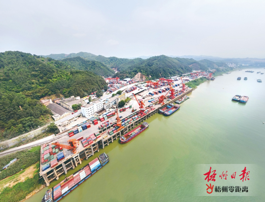 春天里,步入梧州李家莊碼頭,繁忙景象映入眼簾:十多艘貨船一字排開,一排排紅色的吊機運轉自如,裝載著集裝箱的卡車進進出出……