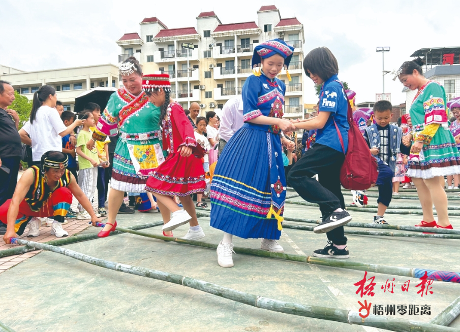 4月13日至14日,在“粵桂一家親·情濃三月三”粵桂青少年研學交流活動中,孩子們跳起了富有民族特色的竹竿舞。本報記者 覃競儀 攝