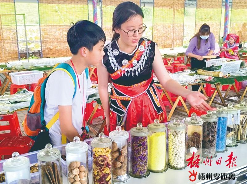 梧州職業(yè)學(xué)院的學(xué)生講解中藥的用途和功效,教大家藥品的辨認(rèn)方法。梁艷 攝