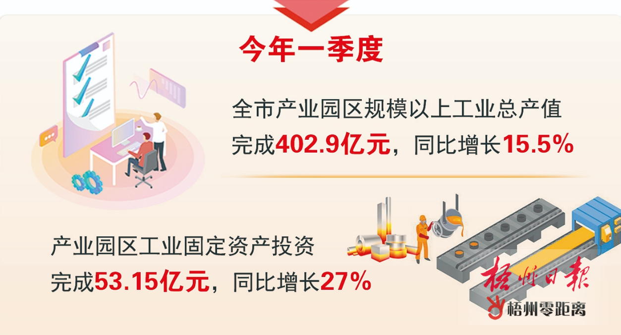 今年,我市繼續堅持產業優先、大抓項目、抓大項目導向,深入實施項目投資“三個千億”工程,推動園區擴量提質發展。今年一季度,全市產業園區規模以上工業總產值完成402.9億元,同比增長15.5%;產業園區工業固定資產投資完成53.15億元,同比增長27%。