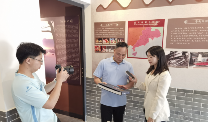 圖為廣西臺記者采訪梁向光介紹粵劇臉譜