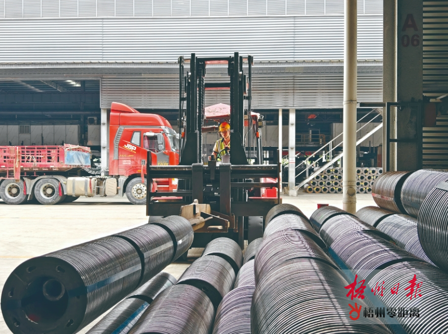 5月23日上午,位于梧州臨港經濟區循環片區的梧州市毅馬五金制品有限公司生產車間里陣陣熱浪撲面而來,一根根通紅的合金鋼坯從煉鋼生產線上出來后,通過輥道快速“沖向”軋鋼生產線,經反復軋制成扁鋼,再由熱卷機卷制成法蘭毛坯卷。