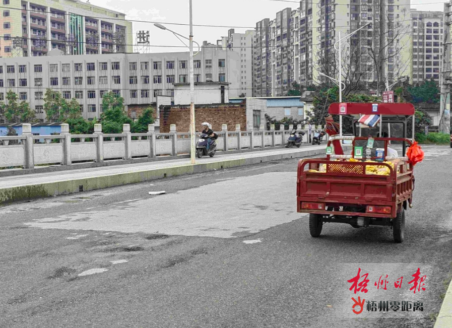 龍圩區廣信路與沿江路交叉口的橋面有多處坑洼不平,給過往車輛和行人帶來安全隱患。梧州日報記者 陳益銘 攝