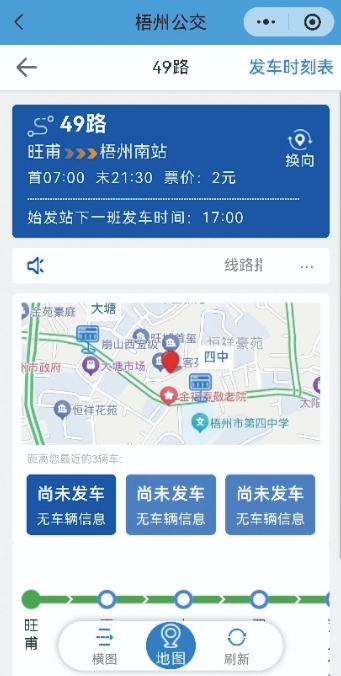 7月23日上午10時,記者來到四中車站,體驗(yàn)這款小程序的實(shí)際使用情況。打開“梧州公交”小程序,首頁醒目的“公交車實(shí)時查詢(測試版)”吸引了記者的注意。然而,當(dāng)記者嘗試查詢具體車次信息時,卻遭遇了信息與實(shí)際不符的尷尬。記者看到,由市福利院站開往廣電中心站的29路公交車顯示未發(fā)車,但在10分鐘后卻已抵達(dá)四中站;由旺甫站開往梧州南站的49路公交車,在3分鐘內(nèi)連續(xù)有兩輛公交車相繼到站,但小程序內(nèi)卻一直顯示“尚未發(fā)車,無車輛信息”。