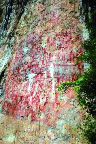 崖壁上的花山巖畫一景,各種形態(tài)的圖案清晰可見。(資料圖)