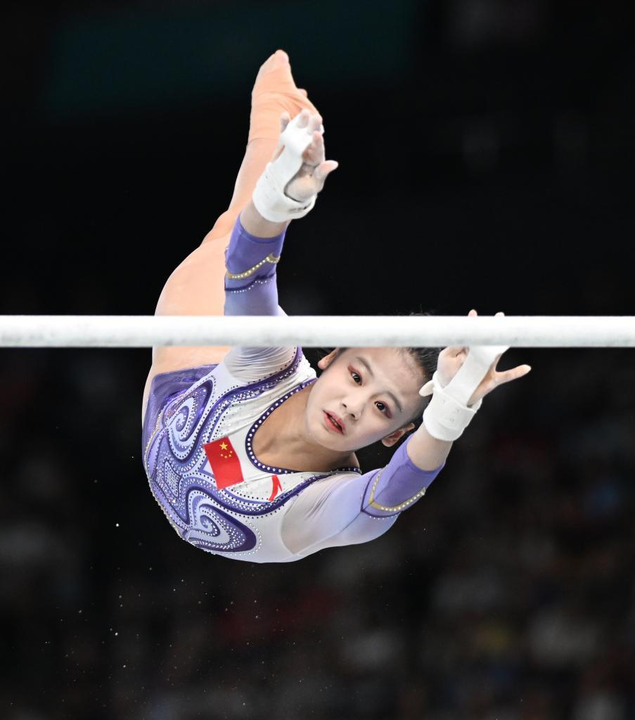 8月4日,中國選手邱祺緣在女子高低杠比賽中。新華社記者 程敏 攝