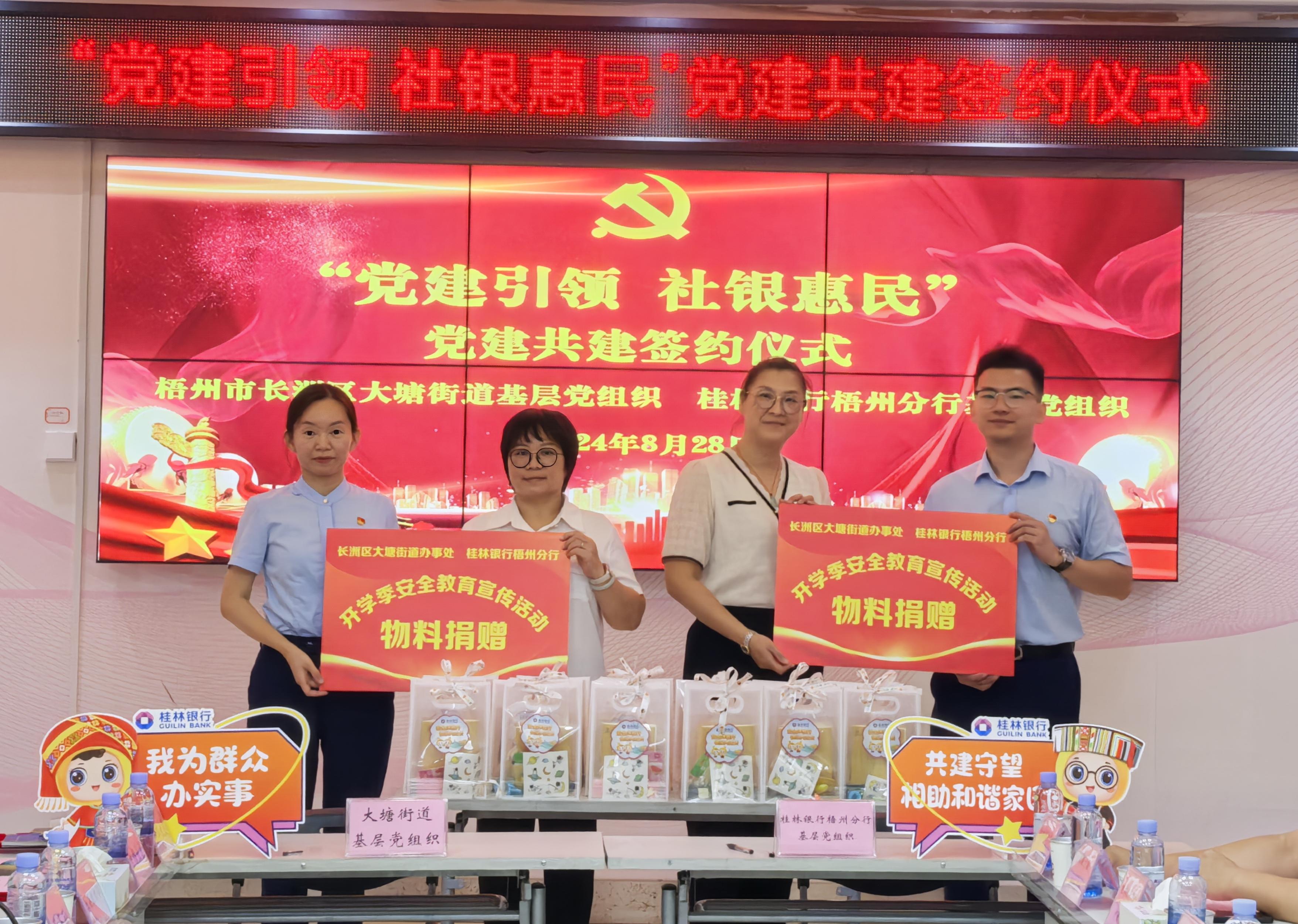 儀式上,桂林銀行梧州分行各基層黨組織與大塘街道黨工委、各社區(qū)黨委進(jìn)行簽約,桂林銀行梧州河西支行黨支部及梧州科技支行黨支部分別向大塘街道華洋社區(qū)黨委、大塘社區(qū)黨委捐贈(zèng)開(kāi)學(xué)季文具用品。