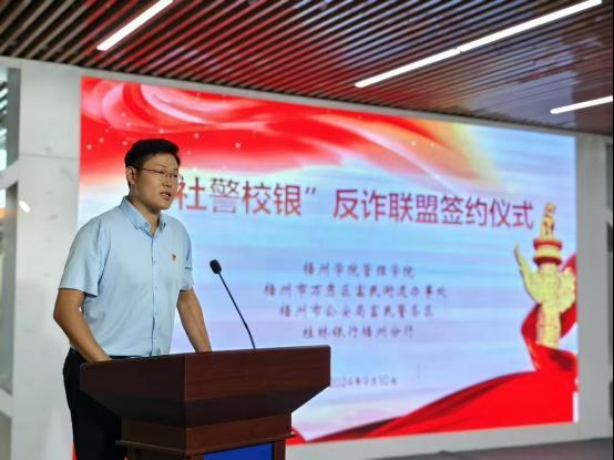 9月10日,桂林銀行梧州分行聯合梧州學院管理學院、梧州市萬秀區富民街道辦、梧州市公安局富民警務區開展反詐聯盟簽約儀式。桂林銀行梧州分行黨委書記、行長杜忠良在儀式上表示,希望以此次黨建共建為契機,在圍繞基礎共建、渠道共享、反詐防詐、人才培養等方面持續深化合作,共同描繪社警校銀融合的新圖景。