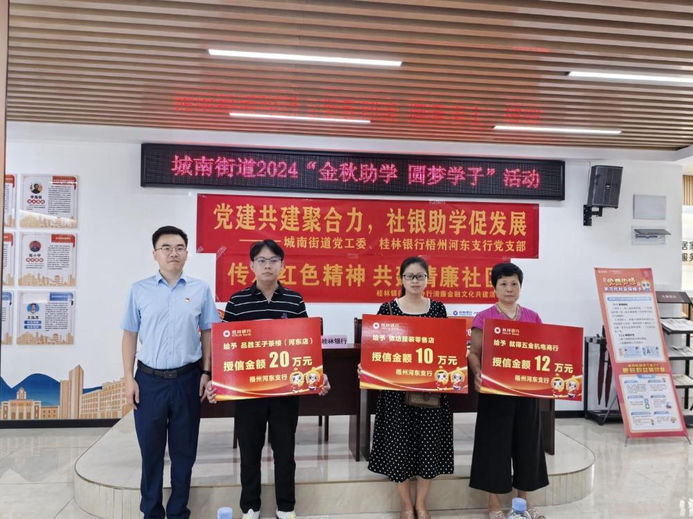 8月29日上午,桂林銀行梧州河東支行黨支部與梧州市萬秀區城南街道黨工委、各社區黨委進行簽約?;顒由希訓|支行黨支部同步聯合城南街道下轄5個社區開展第三代社??〒Q發宣講,并舉行河東小微商戶授信儀式。