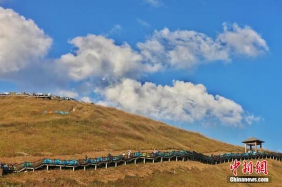 資料圖:圖為江西武功山高山草甸旁的登山步道,游客在登山。劉力鑫 攝