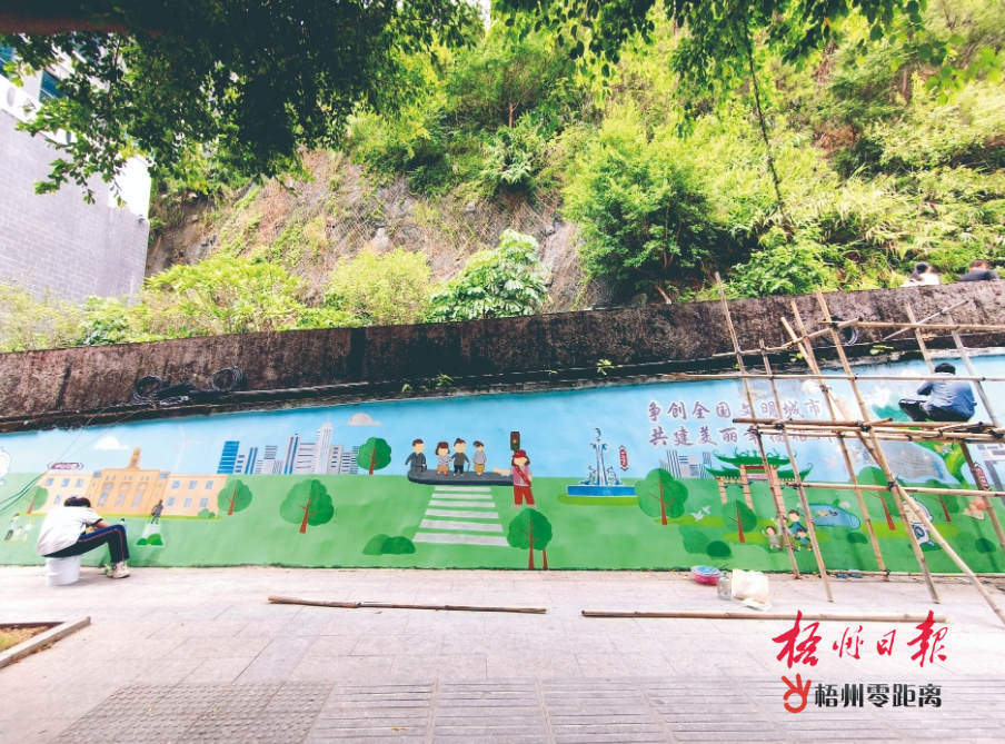 10月20日,在萬秀區大學路珠山腳下,工人正在修補墻上的壁畫。近日,我市城管部門組織工人對市區街道的多處宣傳壁畫進行修補上色,修復壁畫原貌,改善城市環境。梧州日報