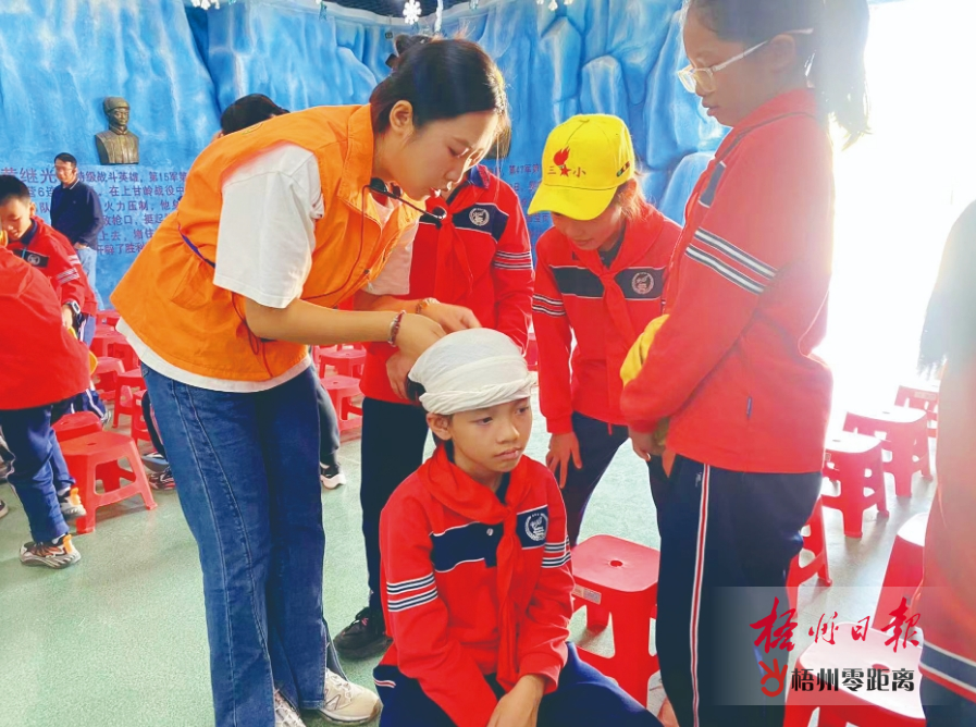 研學老師展示包扎技巧。