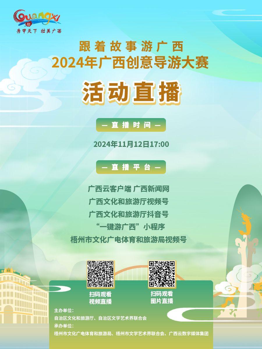 作為2024年廣西文化旅游發展大會的配套活動之一,“跟著故事游廣西”——2024年廣西創意導游大賽將于11月12日在梧州開賽。比賽旨在貫徹落實自治區黨委以文塑旅、串珠成鏈、講好廣西故事的工作要求,發動社會各界編寫創作一批廣西文化旅游故事,策劃推廣一批廣西旅游精品線路,推動廣西文化旅游高質量發展,持續提升“秀甲天下·壯美廣西”文旅品牌影響力。