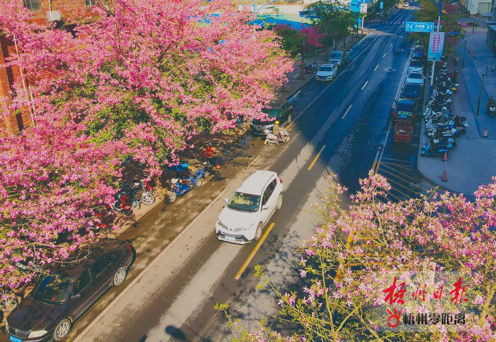 12月1日,松湖路兩側(cè)的異木棉綻放。近日我市天氣晴好,市區(qū)種植的異木棉迎來(lái)花期,成為初冬時(shí)節(jié)的一道獨(dú)特風(fēng)景。梧州日?qǐng)?bào)記者 楊揚(yáng) 攝