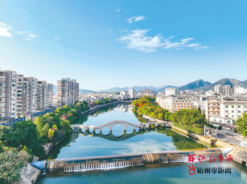 近年來,蒙山縣牢固樹立“生態優先 綠色發展”理念,不斷細化河湖治理、管理與保護舉措,繪就人與自然和諧相處的生態圖景。圖為11月30日航拍蒙山縣縣城,藍天白云與清澈的湄江、九曲橋、兩岸的綠植等相映成畫。 林志清 攝