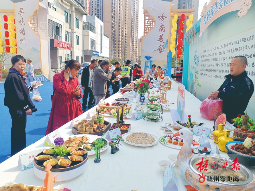隨著會場設置的嶺南美食節活動開始,梧州粵菜擂臺賽風味粵菜獲獎美食、藥膳養生美食、美食展銷活動等區域展示紙包雞、龜苓膏、田螺、牛雜、涼茶等梧州特色美食及非遺美食,現場香味彌漫、人頭攢動。