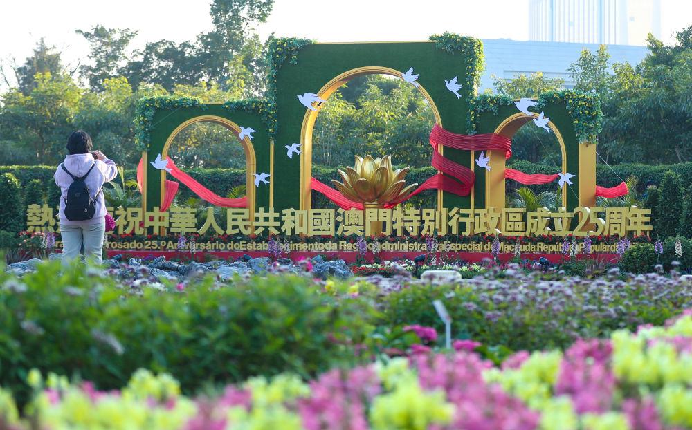 12月17日,市民在澳門一處慶祝花壇前拍照。新華社記者 姚琪琳 攝