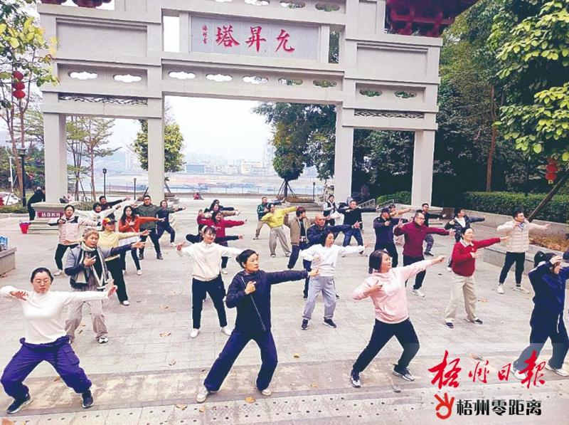 2024年12月26日,萬秀區城南街道塘源社區聯合“雙報到”單位開展“一路向陽 勇攀高峰”登山健步走活動。大家在允升塔牌坊下列隊做八段錦,享受運動的樂趣。 楊建妮 攝