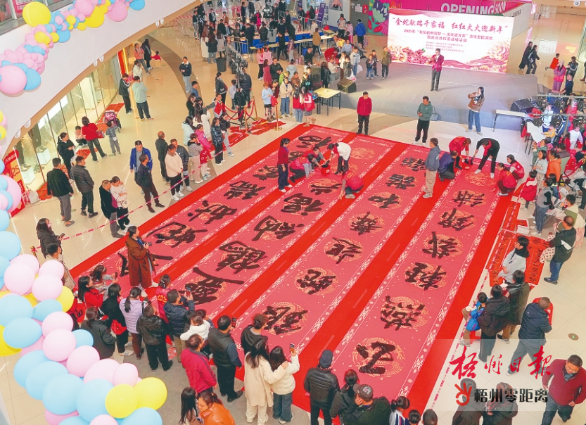 1月1日,書法家現場書寫春聯。 當日,由市文廣體旅局主辦、市群藝館承辦的2025年“我們的中國夢——文化進萬家”揮春送福慶元旦文化惠民演出活動在高旺萬達廣場舉行。活動通過舉辦文藝演出并邀請書法家即席揮毫寫春聯送春聯的方式,營造喜慶祥和的節日氛圍。梧州日報記者 楊揚 通訊員 吳家茵 攝