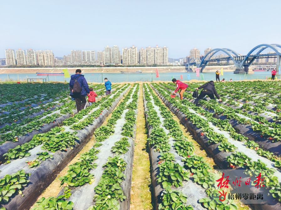 1月11日,人們在高旺防洪堤外的草莓園采摘草莓。 近段時間,梧州陽光燦爛,天氣溫暖如春,不少市民帶著孩子前往草莓園摘草莓,享受休閑時光。梧州日報