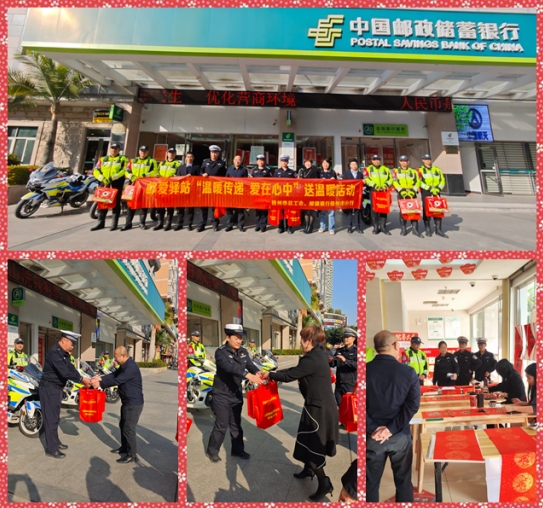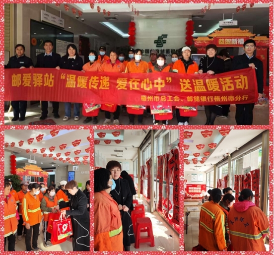 春節(jié)將至,為讓廣大戶外勞動(dòng)者在嚴(yán)寒中感受到溫暖與關(guān)懷,1月17日,郵儲(chǔ)銀行梧州市分行依托工會(huì)驛站在分行營(yíng)業(yè)部開展“溫暖傳遞 愛在心中”送溫暖活動(dòng),為堅(jiān)守在一線的交警和環(huán)衛(wèi)工人送上新春的祝福與慰問。活動(dòng)現(xiàn)場(chǎng),工會(huì)驛站布置得格外溫馨,洋溢著濃濃的節(jié)日氛圍。