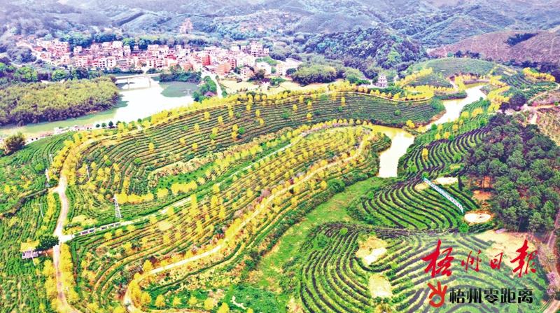 蒼梧縣梨埠鎮(zhèn)仙跡桃花島的黃花風(fēng)鈴燦爛綻放,與美麗的茶園交相輝映。(資料圖片) 黎杰源 攝