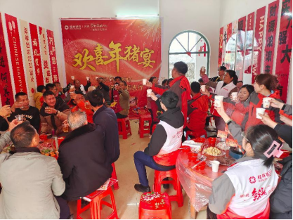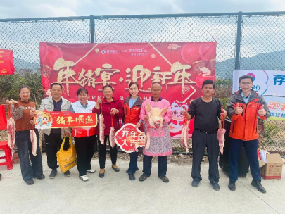 春運(yùn)期間,各地車(chē)站里人群熙熙攘攘,處處充滿了溫馨喜慶的春運(yùn)氛圍。桂林銀行梧州分行與當(dāng)?shù)卣⒐簿值葐挝宦?lián)合開(kāi)展“溫暖返鄉(xiāng)路 桂銀伴您行”活動(dòng),在客運(yùn)站、高速收費(fèi)站、鄉(xiāng)鎮(zhèn)進(jìn)出路口等地設(shè)置“返鄉(xiāng)驛站”,向返鄉(xiāng)群眾發(fā)放金融知識(shí)宣傳折頁(yè),開(kāi)展金融知識(shí)普及,增強(qiáng)返鄉(xiāng)群眾的金融風(fēng)險(xiǎn)防范意識(shí),同時(shí)送上平安福袋、利是封及新春對(duì)聯(lián)等新春紀(jì)念品,讓歸心似箭的返鄉(xiāng)群眾感受到來(lái)自家鄉(xiāng)的第一份溫暖。 同心同席,幸福鄉(xiāng)村“年豬宴”