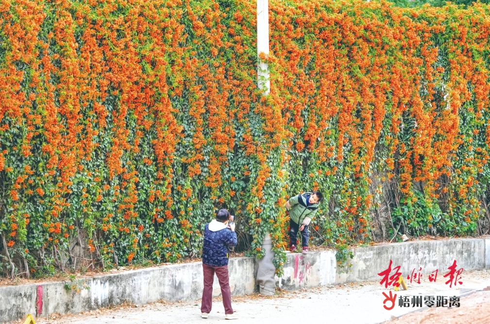 2月8日,在新興小學(xué)校園西墻外,市民與孩子在盛開的炮仗花下拍照。 雖然春寒料峭,但是市內(nèi)各處炮仗花依然熱烈盛開,橙色的花朵在墻頭如瀑布般瀉下,看得人心花怒放。梧州日?qǐng)?bào)記者 何鎏 攝