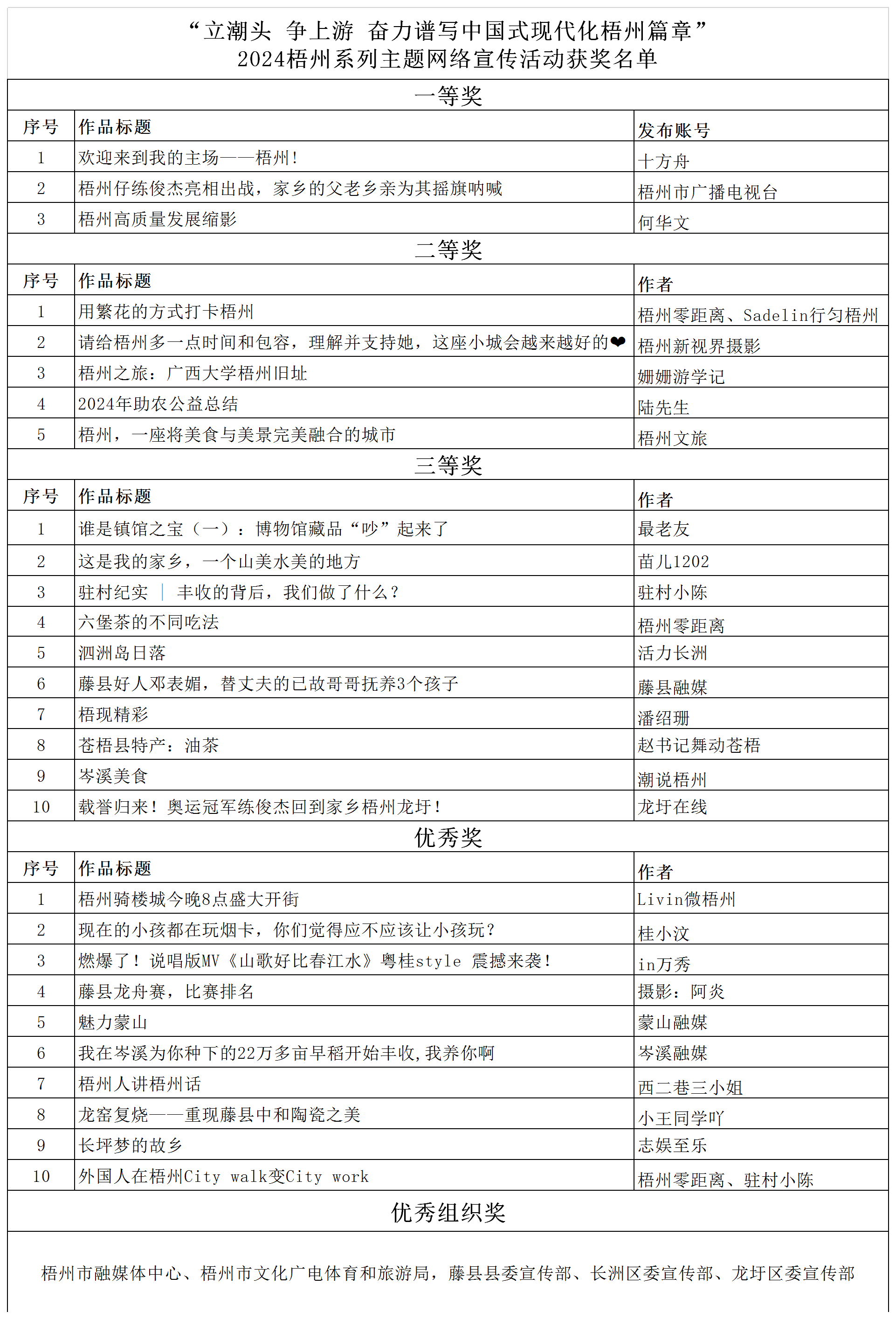 2024年,梧州市委宣傳部、市委網信辦組織開展“立潮頭 爭上游 奮力譜寫中國式現代化梧州篇章”2024年梧州系列主題網絡宣傳活動。圍繞“開放發展亮本領、城鄉變化看顏值、嶺南名城品新風、閱盡繁華秀風采”四大主題,通過線上線下相結合方式,邀請各級主流媒體和部分網絡名人到我市開展創作采風,并發動廣大網絡名人、網友群眾和市民游客參與。 活動得到了各有關單位、團體和廣大媒體記者、網絡名人、網民群眾的積極參與,推出了眾多高質量的融媒作品,形成了點贊梧州的濃厚氛圍,為奮力譜寫中國式現代化梧州篇章匯聚了強大精神力量。其中,以“點贊梧州”為主話題,線上共征集到正能量作品超1萬件,在抖音傳播量超1.1億次、視頻號傳播量超1億次,全網傳播量超5億次。 活動涌現出一批優秀作品和先進個人。經過組委會認真嚴格評審,現評選出一等獎作品3件、二等獎作品5件、三等獎和優秀獎作品各10件、優秀組織獎5個。現將擬獲獎名單公示如下: