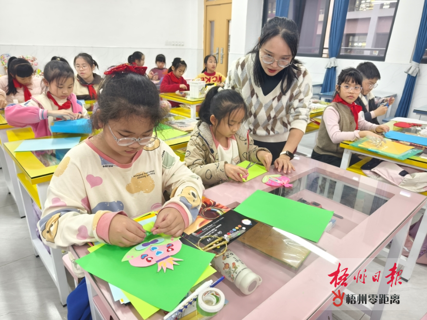 工廠路小學的學生們在該校的臻粹非遺文創社團學習制作特色剪紙。梧州日報記者 甘沁雨 攝