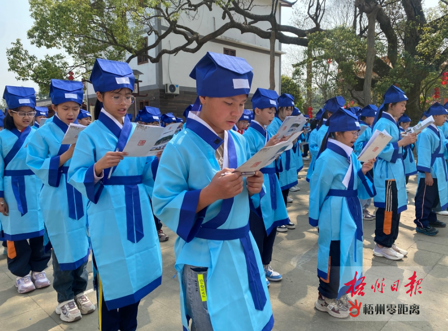 3月21日上午9時,在詩畫富回演藝大舞臺前,學生們齊聚一堂學習國學禮儀文化。