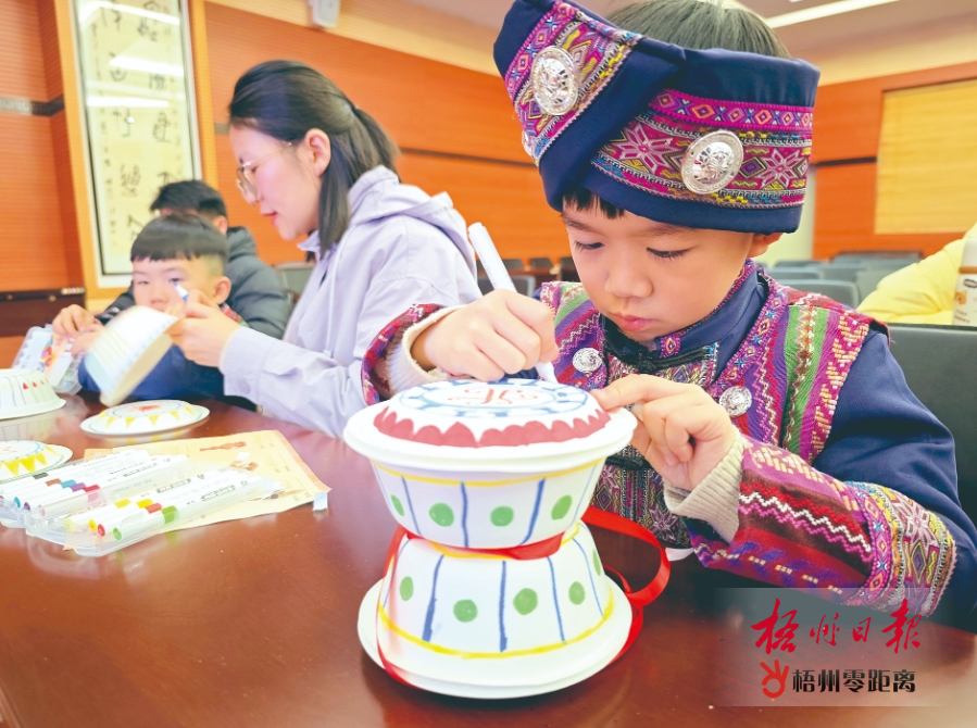 3月31日,身著民族服裝的小朋友在活動中制作小銅鼓模型。當日,梧州市博物館舉行廣西三月三宣傳活動。活動中,小朋友和家長在志愿者帶領下,制作小銅鼓模型,感受民族文化。梧州日報記者 何鎏 攝