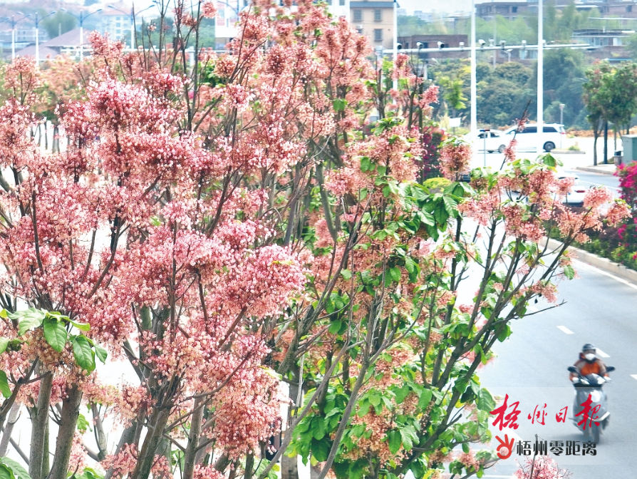4月20日,在六旺路,沿線的六旺樹開出了淡紅色的小花。
