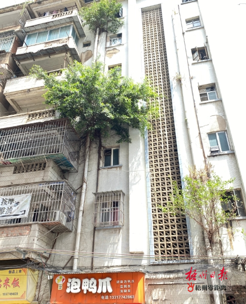新興一路197號居民樓外墻壁的植物長成一棵小樹。記者 黃子萃 攝