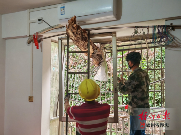 梧州零距離網-梧州日報訊 近日,受強降雨天氣影響,位于萬秀區錢鑒路12號窖沖小區A單元后方的山體出現樹木傾倒,倒伏的樹干橫臥在2樓住戶的防盜網及窗戶中,雖無人員傷亡情況,但對居民日常生活造成影響,存在安全隱患。