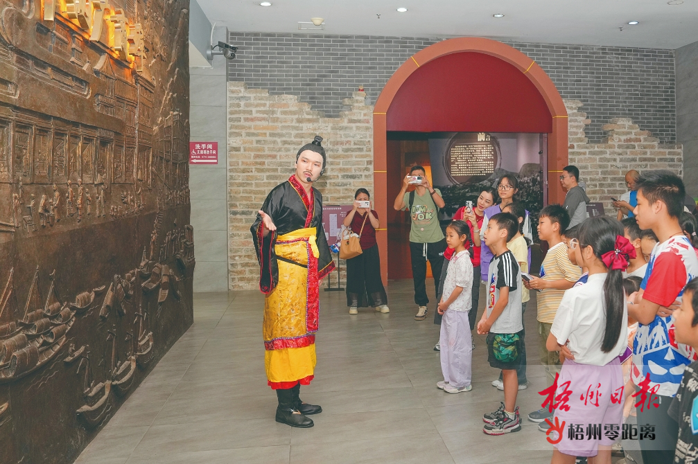 5月18日,市博物館開展的“古韻梧州 夢回千年”沉浸式大闖關(guān)社教活動中,身穿古代服裝的講解員為小朋友們介紹梧州歷史。梧州日報記者 楊揚 攝
