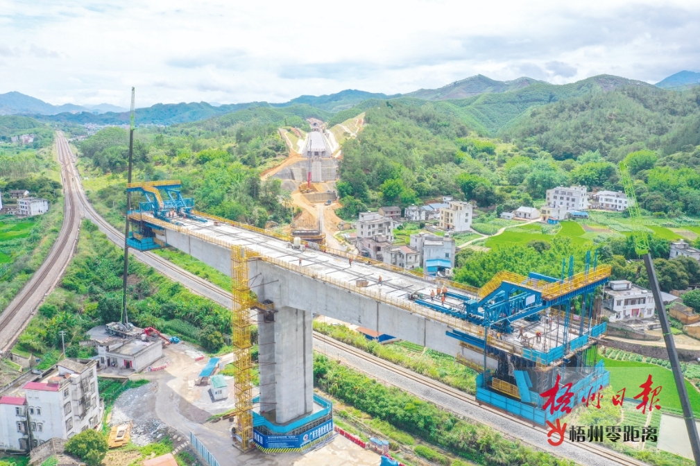 5月18日,在岑溪市馬路鎮(zhèn)義垌村南珠高鐵義垌特大橋施工現(xiàn)場,建設(shè)者正在修筑橋梁。