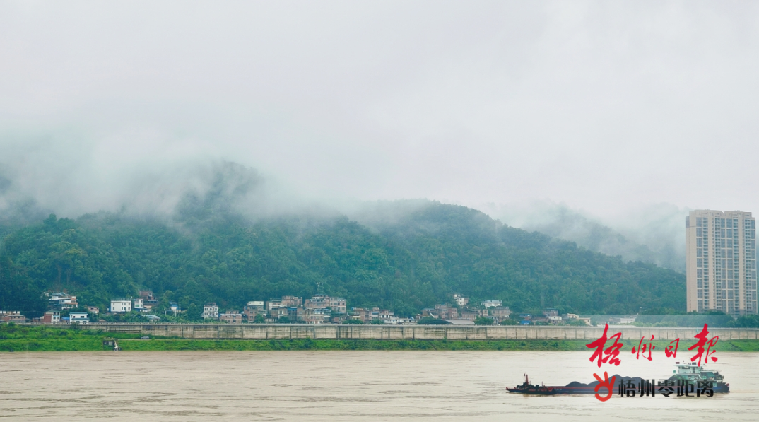 當日一場雨后,云霧如輕紗漫卷,西江畔的群山若隱若現,江上貨船徐徐前行,防洪堤靜靜守護堤內安全,構成了一幅和諧的山水畫卷。梧州日報記者 李鴻榮 攝