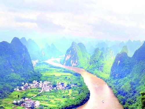 漓江如一條綢帶,在群峰環(huán)抱中迤邐遠去。