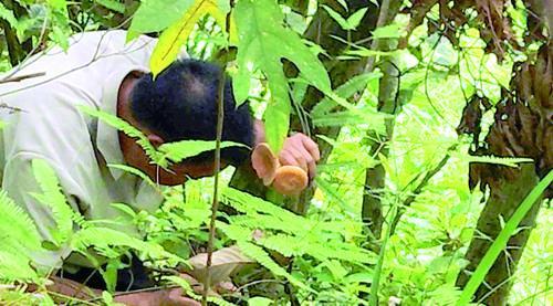 當地的向導介紹,山里有紅菌、黃猄菌等,是本地常見的野生菌,有特殊的香氣和緊實的口感。途中,向導不時提醒,山里蚊子多,更要防蛇出沒??上覀儧]有經驗,事前防護準備工作沒做好,穿的是短袖,清涼油、花露水等都沒拿來。幸虧向導貼心,事先準備好草帽、防蚊液。