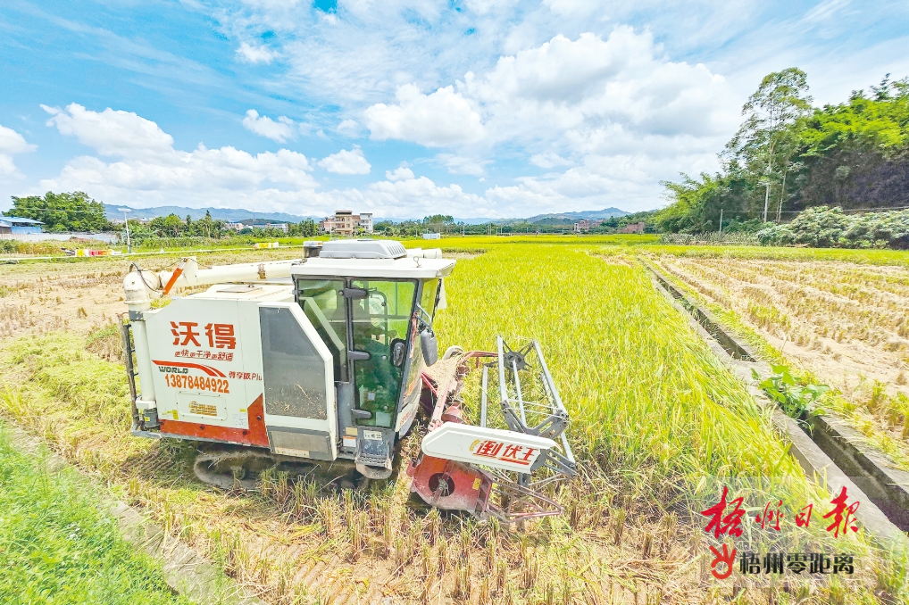 “你看,遠處金燦燦那一塊稻田,長得最好的就是我家的。”田埂上,農戶羅阿姨頭戴草帽,手中提著編織袋和打包繩,緊盯著來回作業的收割機,等待著將飽滿的稻谷收入袋中。她說,今年家里種了約30畝早稻,收割工作還要持續幾天,每畝預計比去年增產約100公斤。今年初雖然遇上干旱天氣,但是鎮村干部積極幫助農戶做好抽水灌溉工作,大家得以適時早播,而且后期天氣好、雨水好,今年的早稻長勢也好,稻穗飽滿。