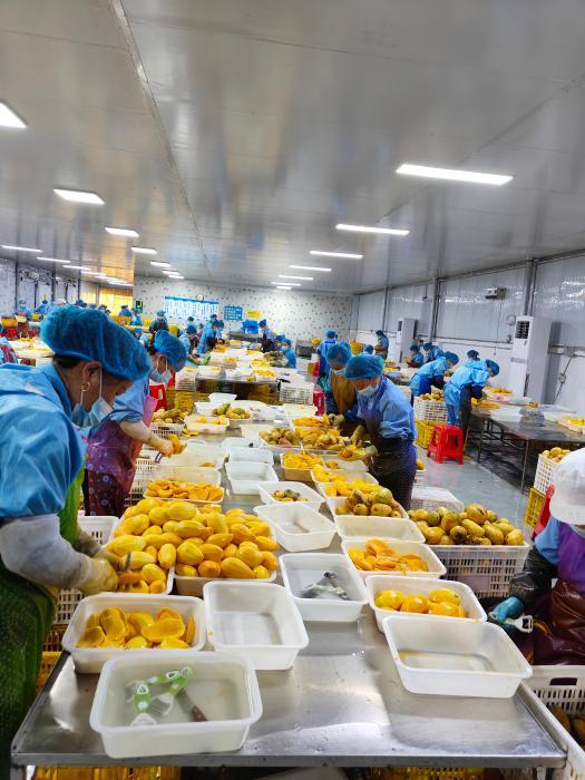 圖為廣西田東興德農業發展有限公司生產車間內,工人們正在加工芒果。羅先彬 攝