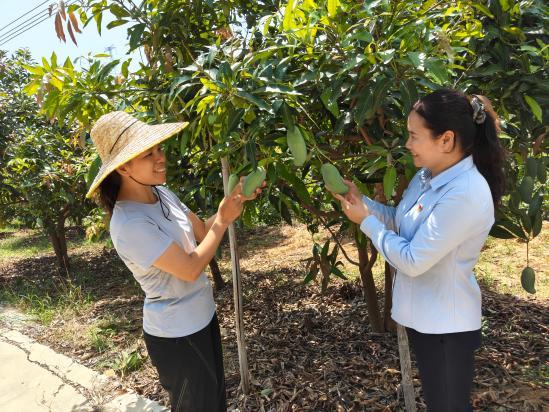 圖為田東縣林逢鎮公靖村芒果農業合作社負責人黃艷芳(左)向郵儲銀行工作人員介紹今年芒果產銷情況。羅先彬 攝